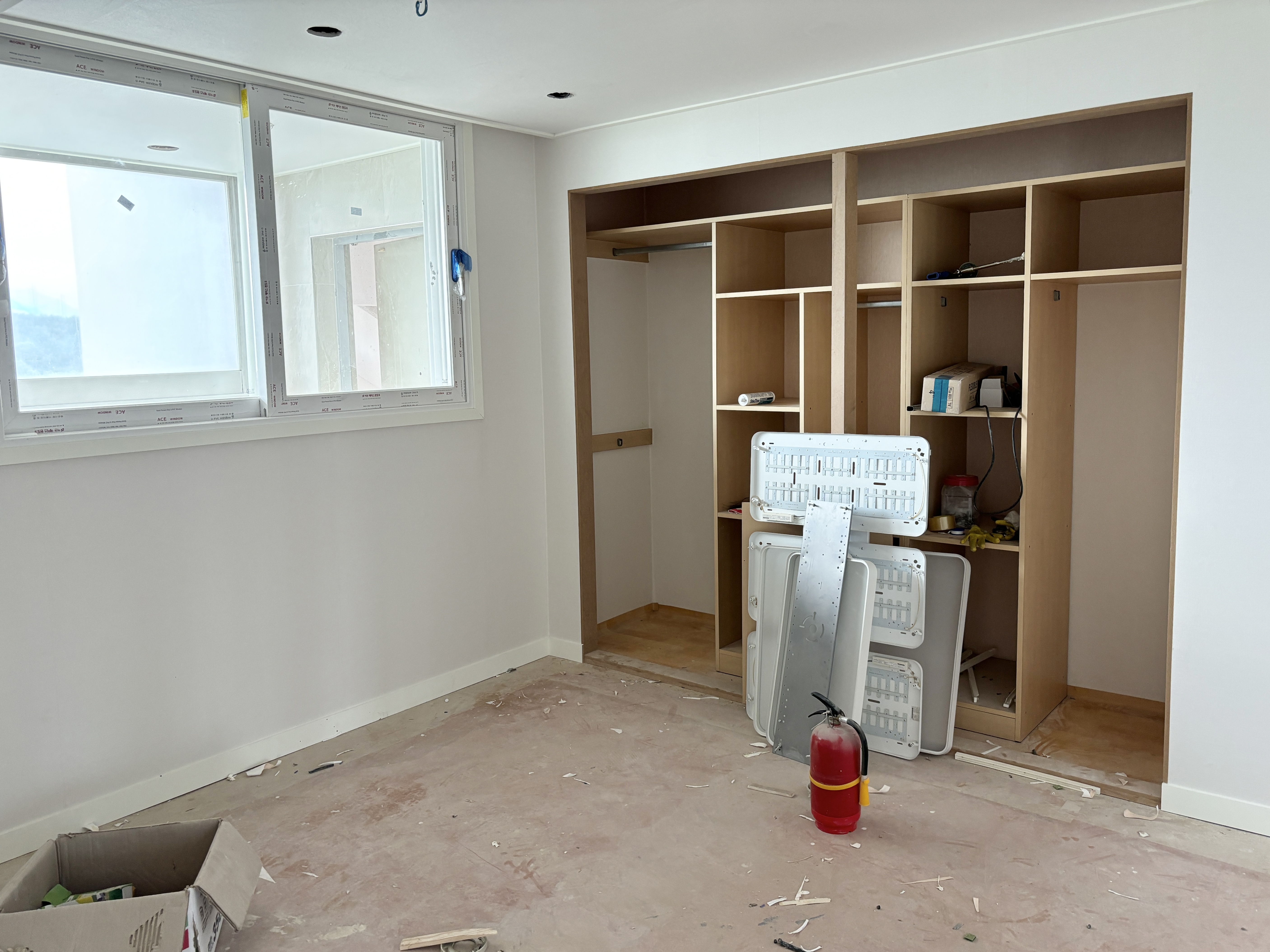 창 옆 한쪽 벽면은 붙박이장을 설치하기로 했고, 화장실 및 파우더룸 공간으로 들어가는 쪽에는 슬라이딩 도어를 설치할 예정입니다.