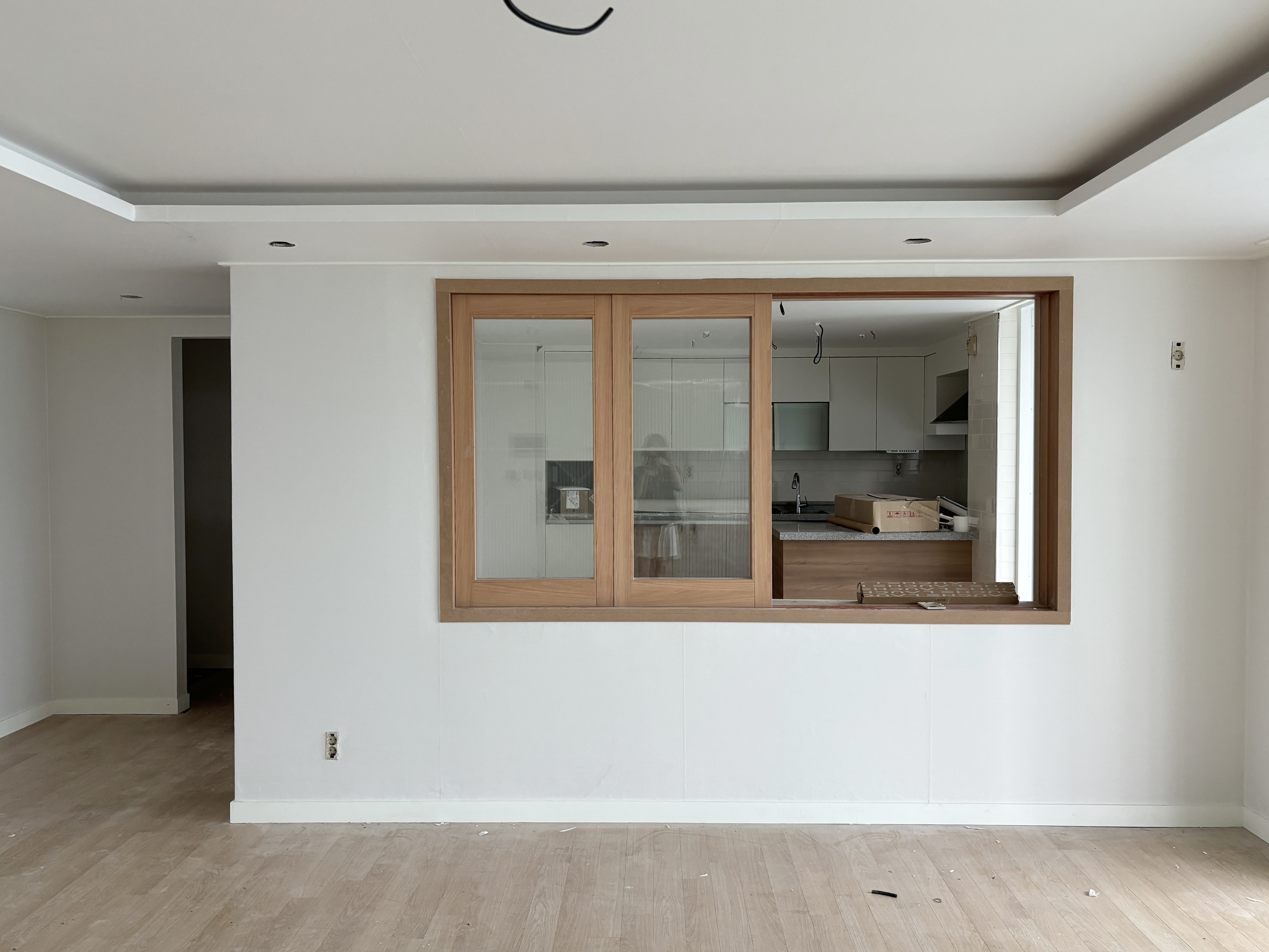부엌과 거실 사이에 큰 창이 있는데, 안에 붙어있던 창 간살을 모두 떼어냈어요.